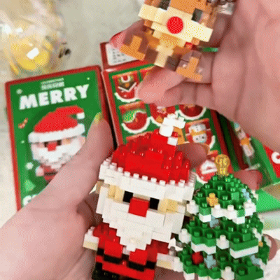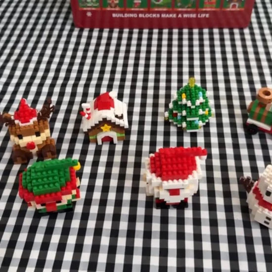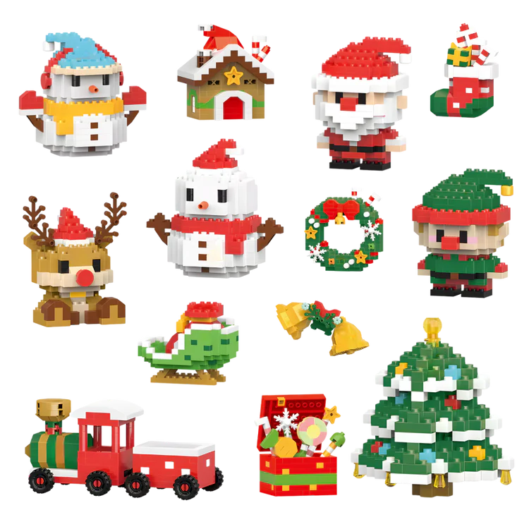 - 12 mini kits de construcción empaquetados individualmente, incluyendo: Papá Noel, muñeco de nieve, reno, árbol de Navidad, tren de regalos, elfo, casa de jengibre ¡y más!